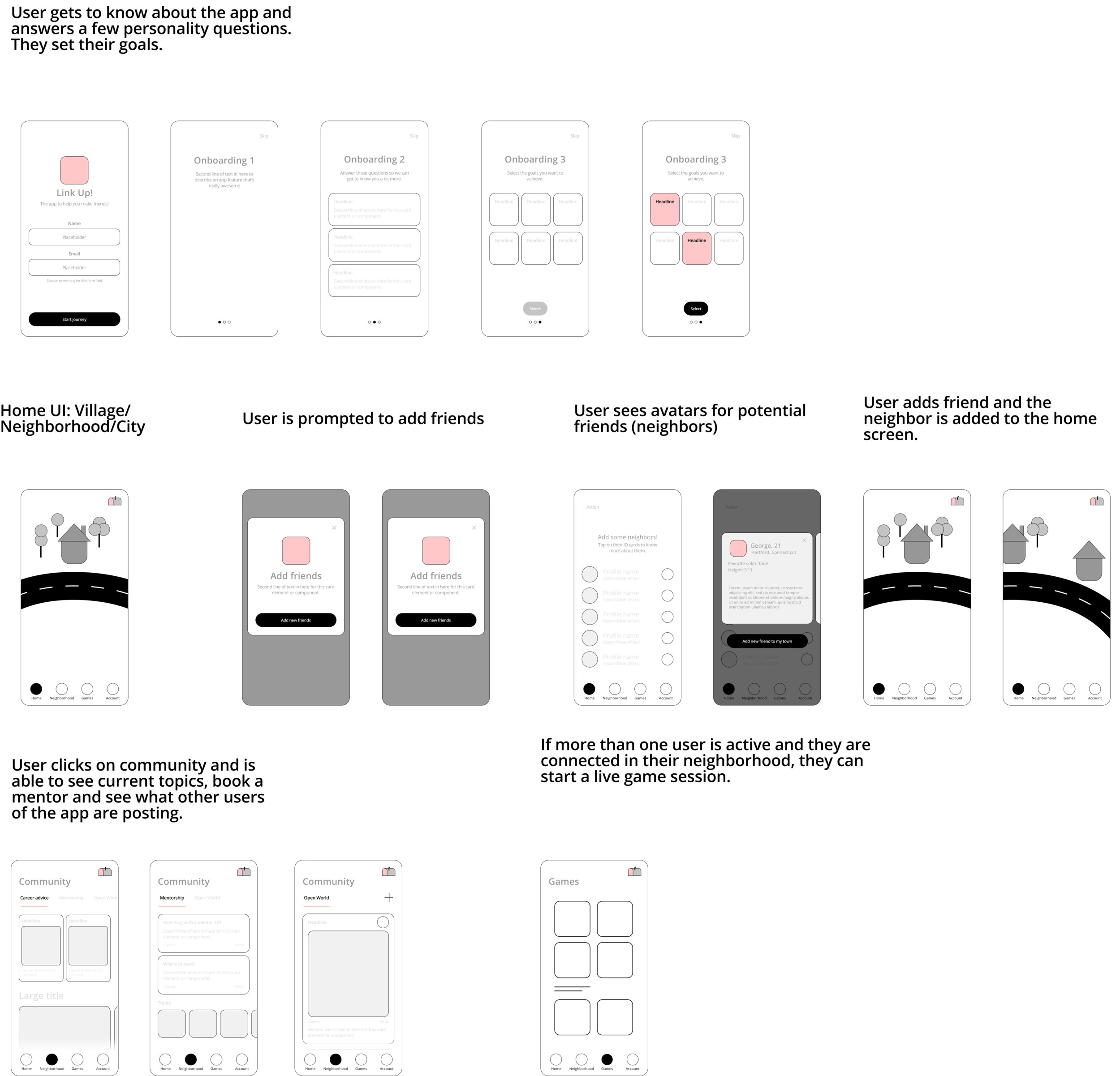 After receiving feedback from my peers, I defined how users would onboard the app as well as how they would interact with the different features. Would they be prompted or notified?