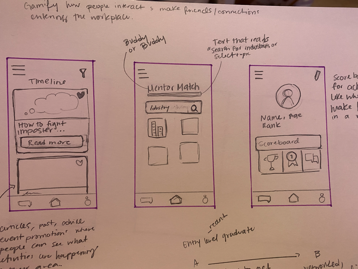 Being a newcomer can be nerve-wracking. You have to deal with feelings of imposter syndrome in a world where everyone seems very confident and well established in their industry. I plan to design a way for recent graduates or entry-level employees to make networking feel more like mingling while reducing the pressure of first impressions.